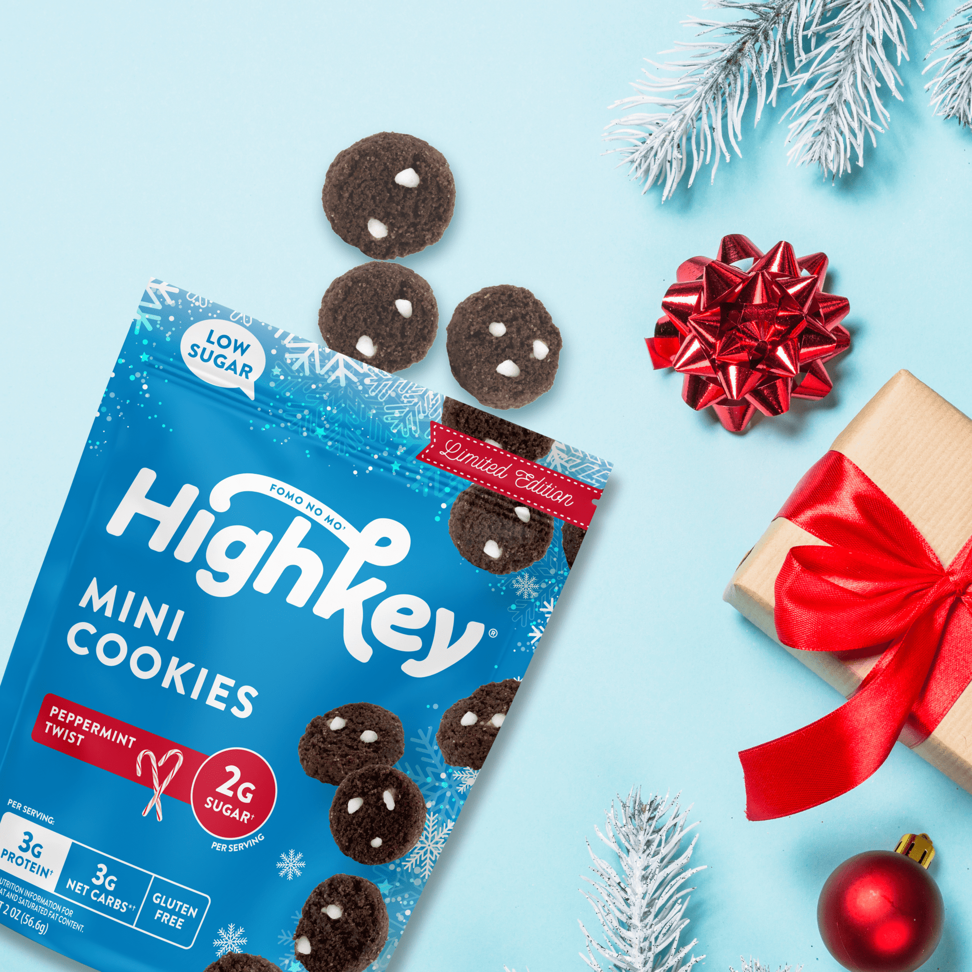 Made with almond flour, white chips and cocoa powder, these cookies look and taste naughty, but they’re not! Sugar is elfed up. That’s why we only use 2g of it in each serving of our Peppermint Twist Mini Cookies. Plus, each bag packs 6g of protein.
